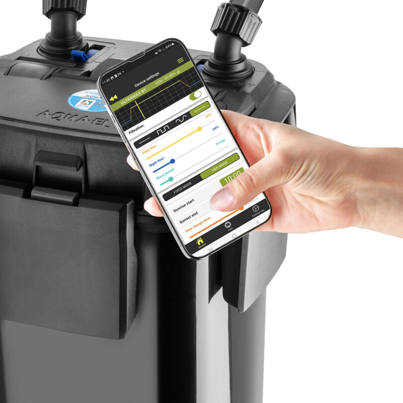 Si el modelo Ultramax BT se controla a través de la aplicación Aquael BT en Bluetooth. Puede ajustar el flujo, cambiar el modo de flujo o las horas de funcionamiento del programa desde su teléfono o tableta.