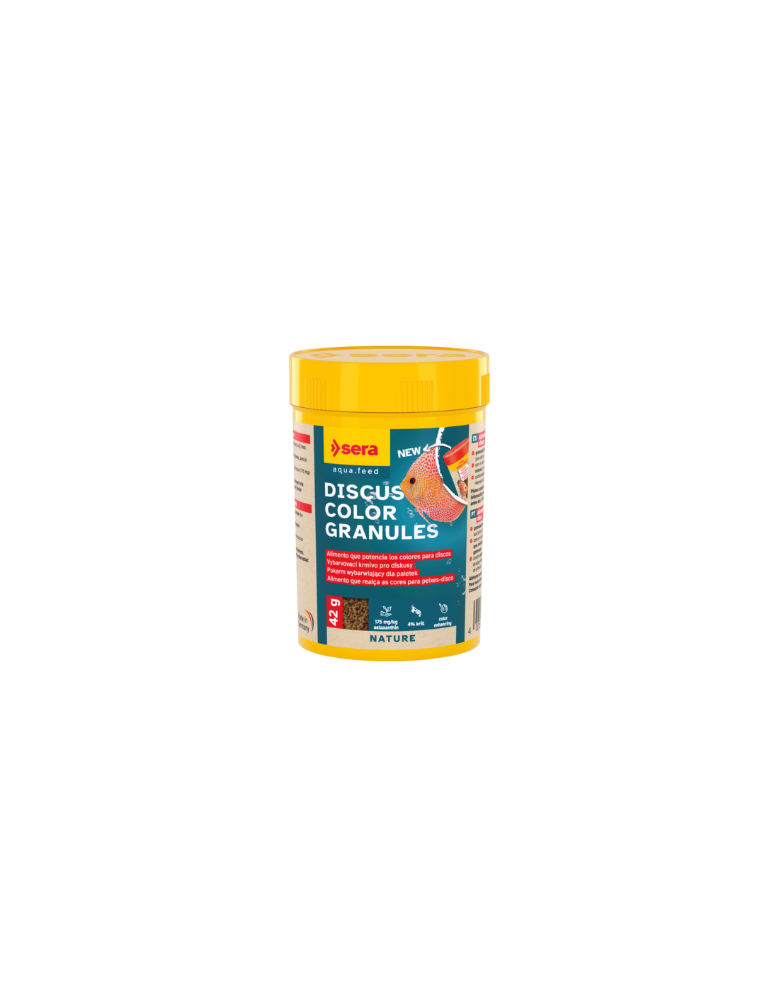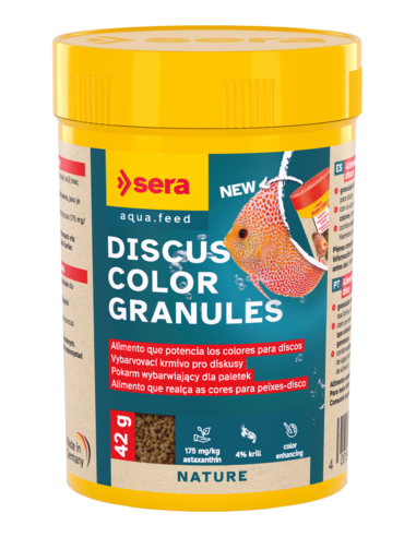 Discus Color Granules es el alimento que potencia los colores, a base de granulado blando cuidadosamente elaborado, sin colorantes ni conservantes, para todos los discos.
