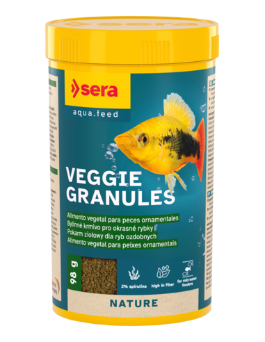 Veggie Granules es el alimento vegetal, para todos los peces ornamentales herbívoros que se alimentan en las zonas intermedias del agua, sin colorantes ni conservantes.